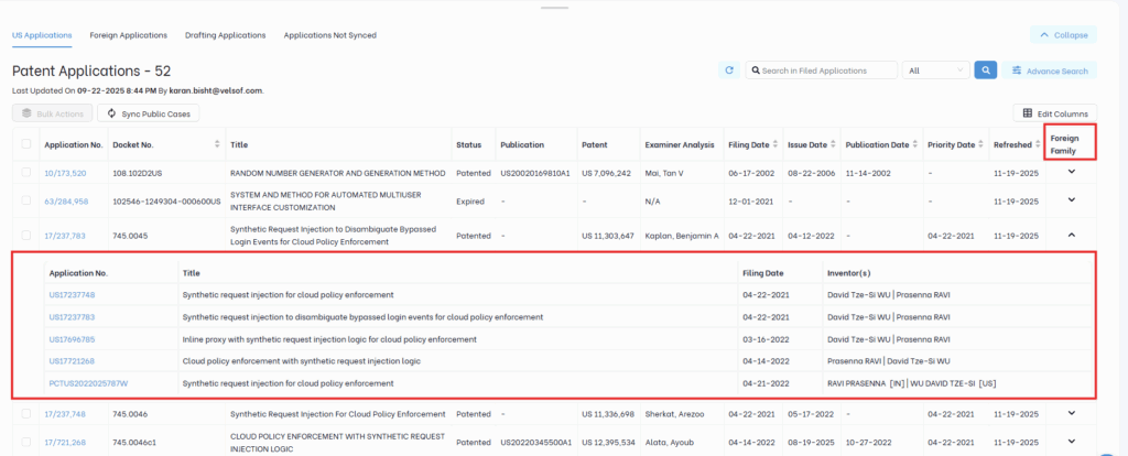 - Appear in your Foreign Applications tab and become fully searchable and filterable