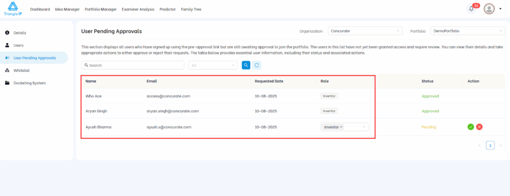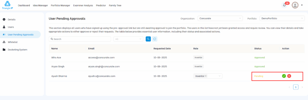 Step 2: Review the list of pending users. Each record includes Name, Email address, Requested Date, Requested role (default: Inventor), Status and Action.