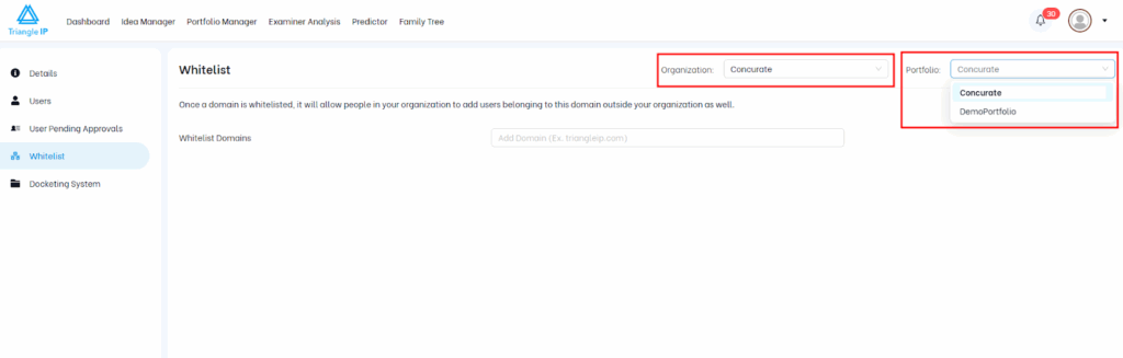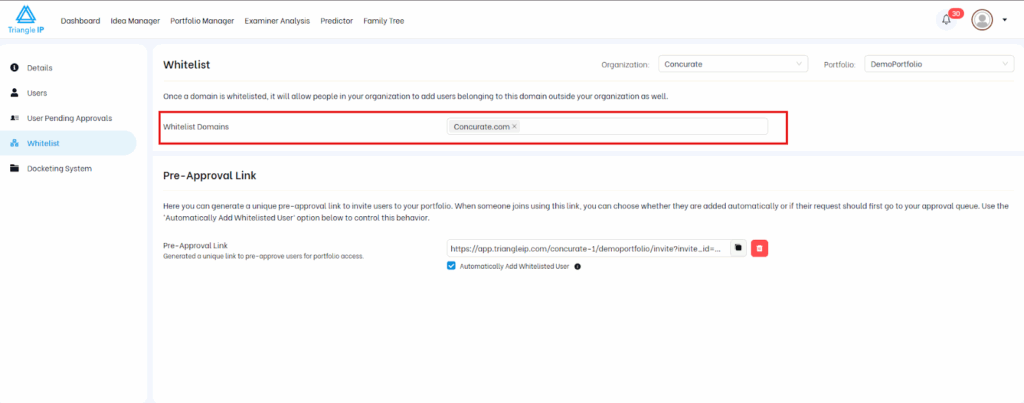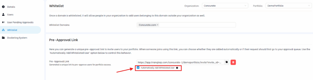 To enable this, admins must first whitelist the company’s domain (e.g., yourcompany.com), ensuring that only users with company emails can be automatically added as a user in the portfolio.