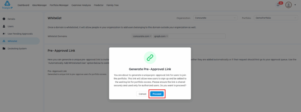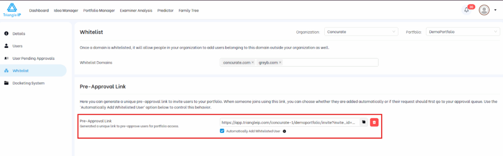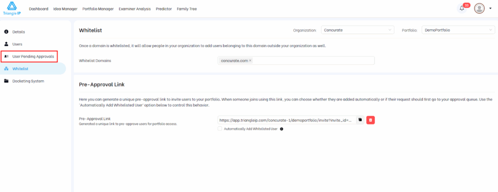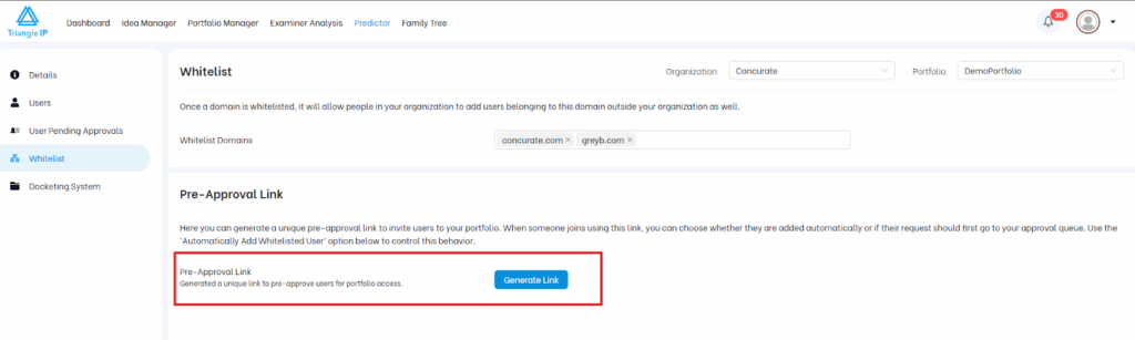 Existing inventors can easily share the Pre-Approval Link with colleagues from the same organization or domain.