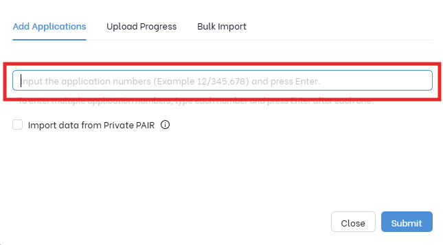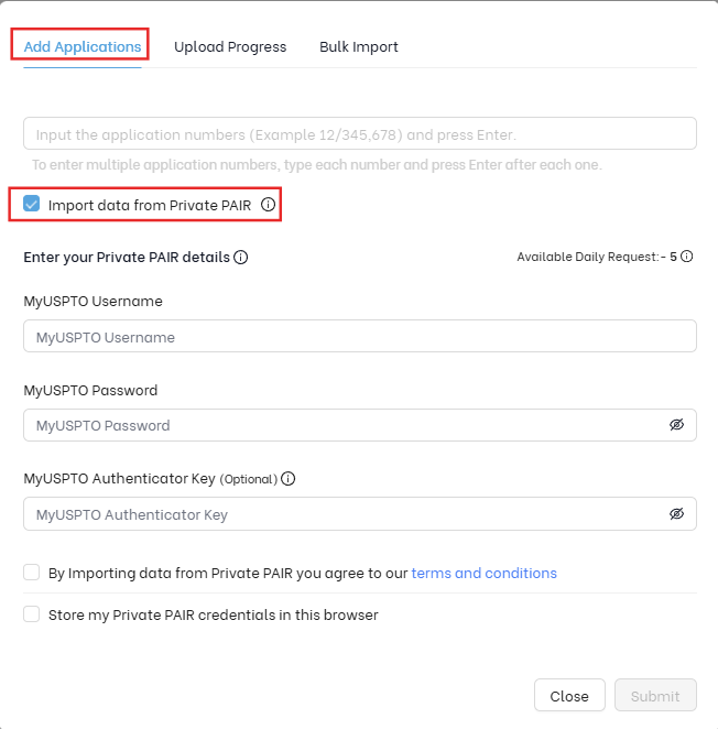 - For private cases, select the “Import data from Private PAIR” option and enter your USPTO account credentials to retrieve the application data.