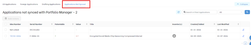 Additionally: If the TIP Tool™ cannot retrieve USPTO data for an application, it appears under the “Applications Not Synced” category.