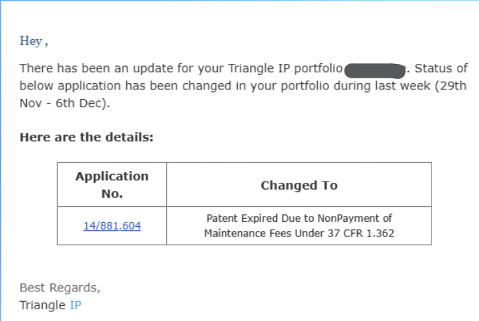 Weekly email updates summarize changes in application status and prosecution activity across the portfolio. This ensures stakeholders remain informed without needing to log into the platform regularly.