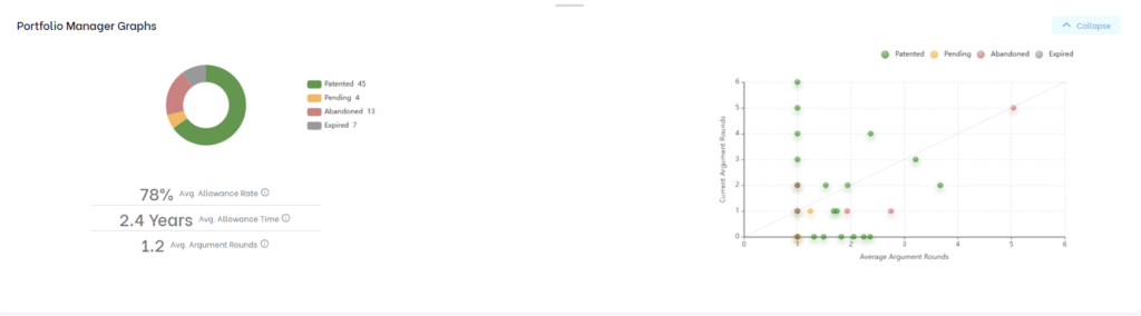 Portfolio Manager provides a high-level view of how applications are distributed across key statuses such as pending, patented, abandoned, and expired. This allows managers and IP teams to quickly assess overall portfolio progress without reviewing individual applications one by one.