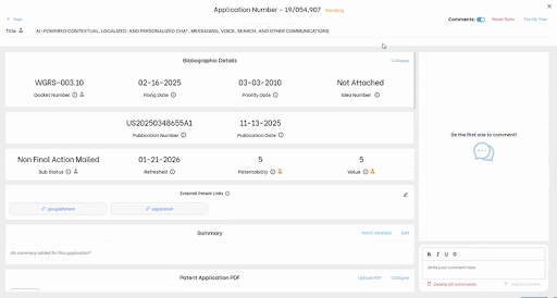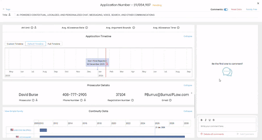 When the USPTO issues an office action or other prosecution event, users can open the relevant application to review the update and understand its impact. This helps determine whether follow-up with patent counsel or internal teams is required.
